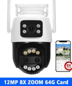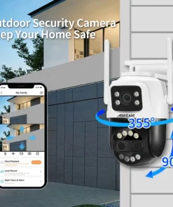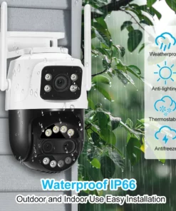 Dual lens, Dual screen, Notifications alarm, humanoid tracking, two way voice intercom 360 monitoring, full color night vision, IP66 waterproof, mobile phone remote monitoring,Share video, SD card storage, 24 hours video recording.