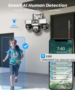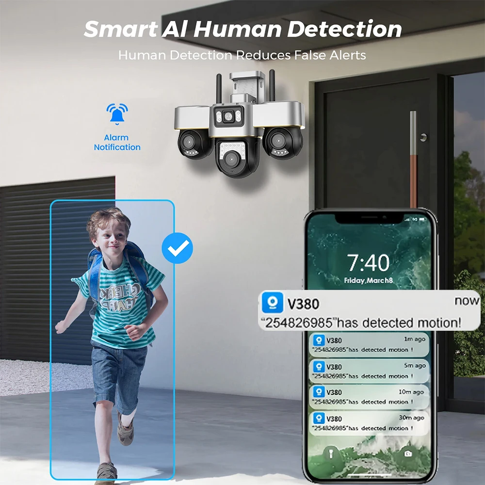 Smart motion detection reduces false flerts.When detecting someone within range, the camera will sound an alarm and push the message to your smartphone via V380 Pro app.