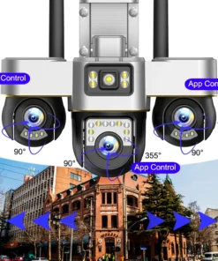 Below lens rotates 355° hrizontally and 90° vertically.Left and right lens rotates 180 °and 90 °vertically.You can control it in the APP directly whenever you want and wherever you are.